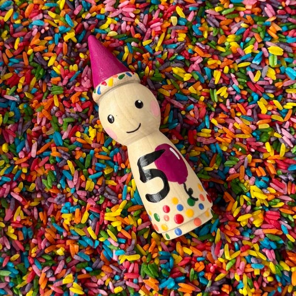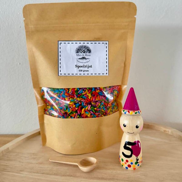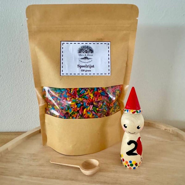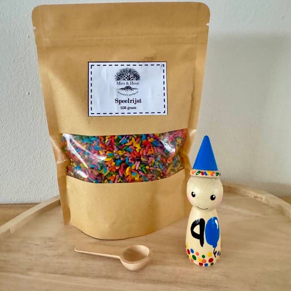 Hoe leuk is het ook je eigen verjaardags pegdoll cadeau te krijgen als je jarig bent? Inclusief zakje speelrijst Feest van 250 gram en een houten schepje.