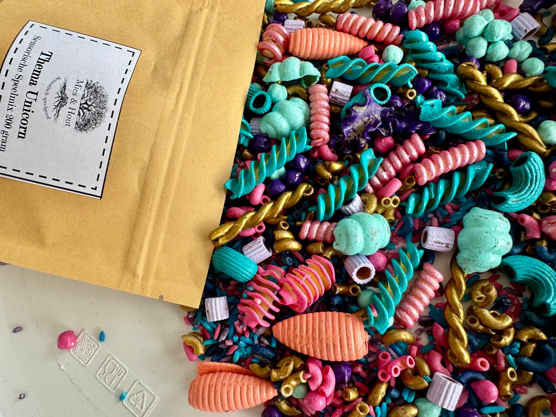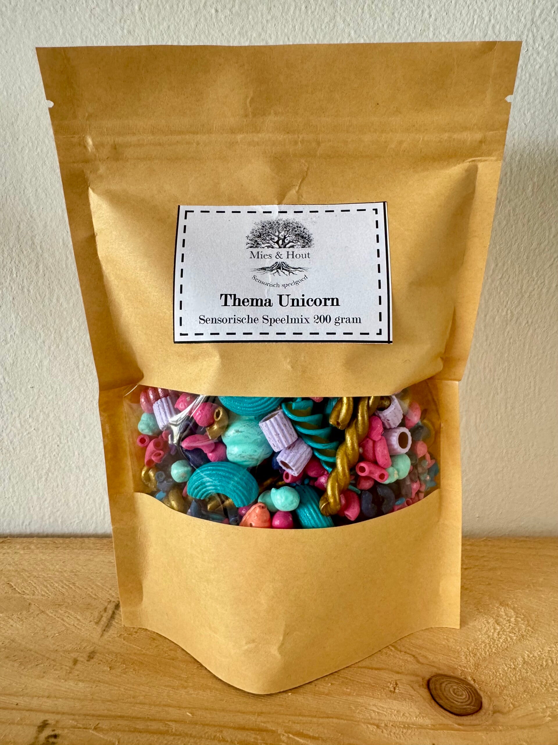 Zakje sensorische speelmix á 200 gram. Elk zakje heeft een unieke samenstelling van speelrijst, macaroni, kikkererwten en verschillende pasta soorten.