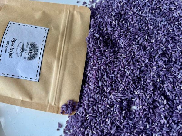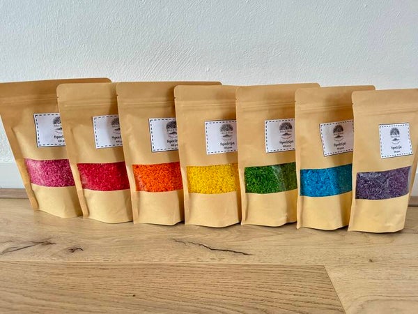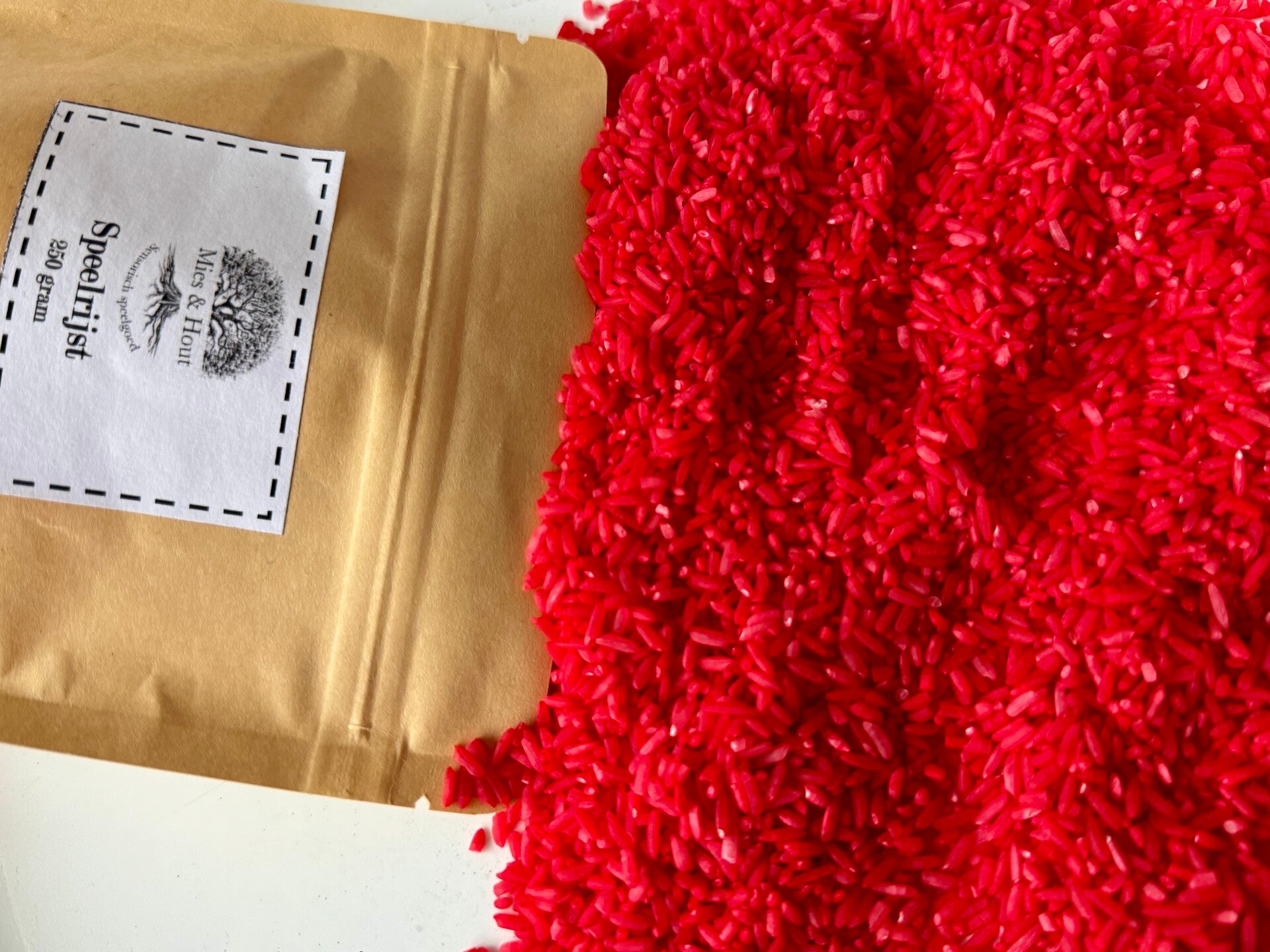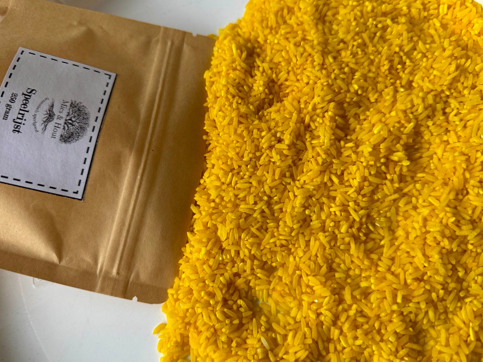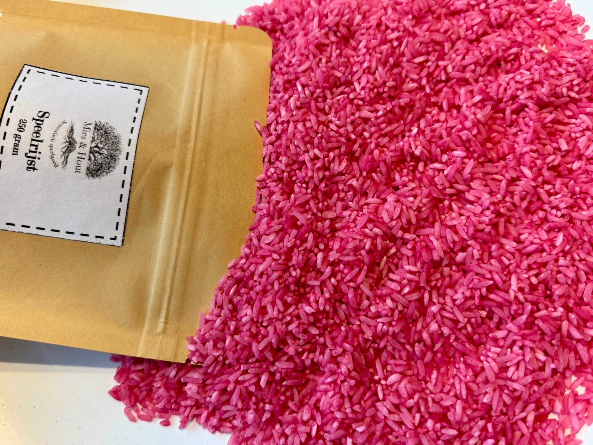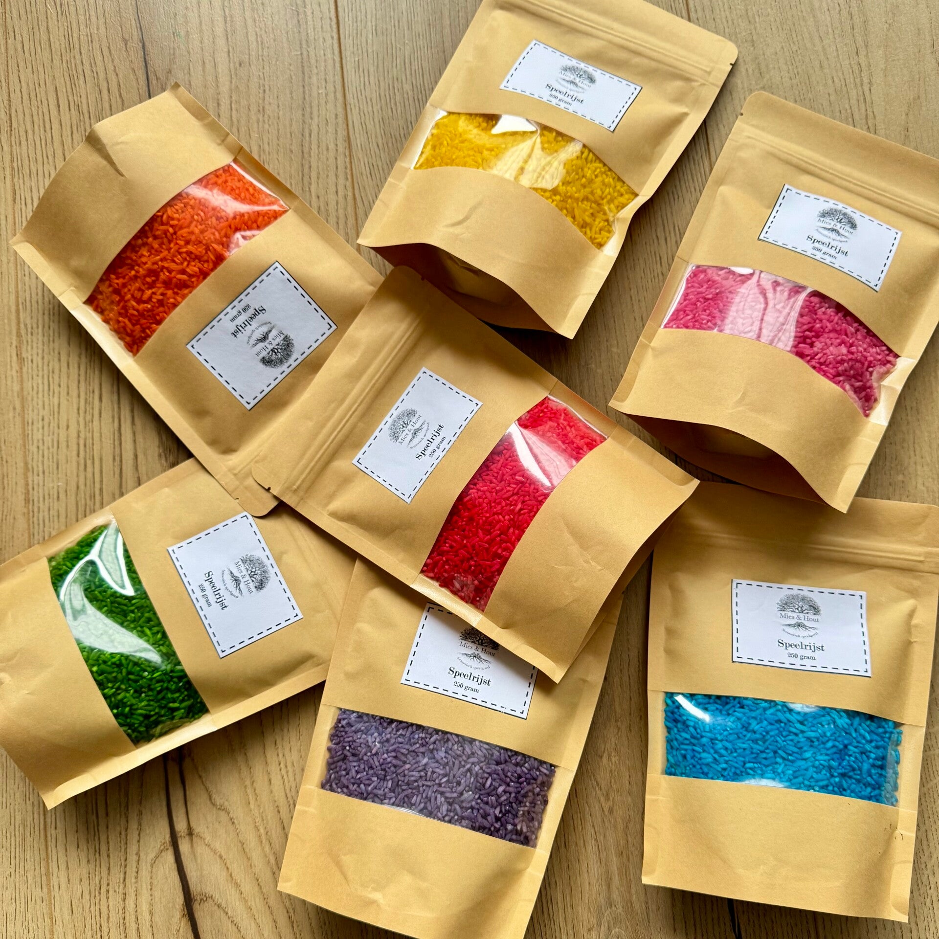 7 verschillende zakjes speelrijst van 250 gram in 7 kleuren van de regenboog. Totaal maarliefst 1750 gram.