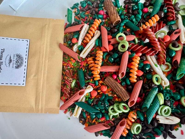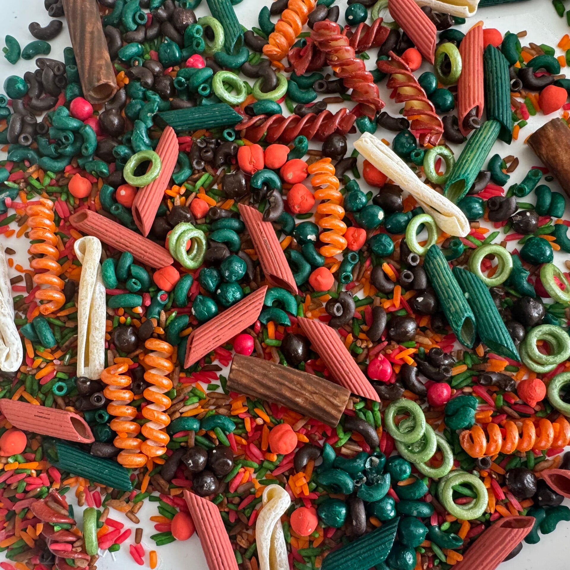 De speelrijst is kleurvast gekleurd door middel van natuurazijn, voedingskleurstof, gedroogd en afgebakken in de oven. De pasta’s zijn gekleurd door middel van kindvriendelijke (gifvrij) acrylverf, gedroogd en afgebakken in de oven.