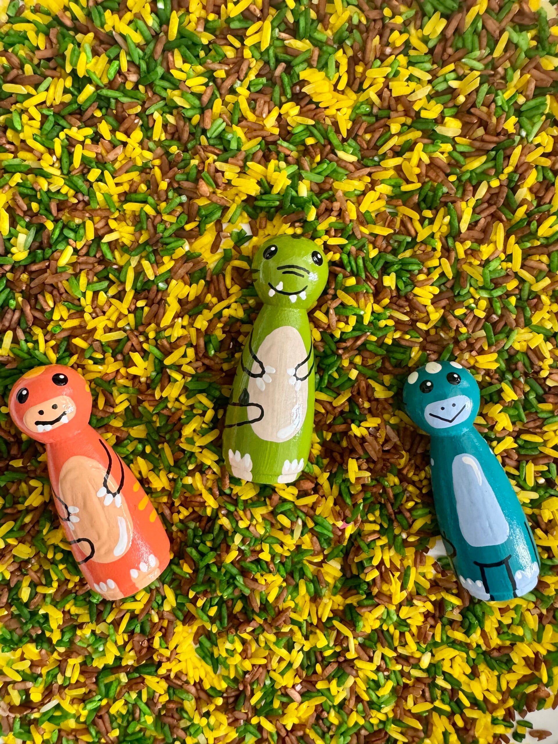 Setje van 3 verschillende dinosaurus pegdolls van 6,5 cm en een zakje speelrijst.
