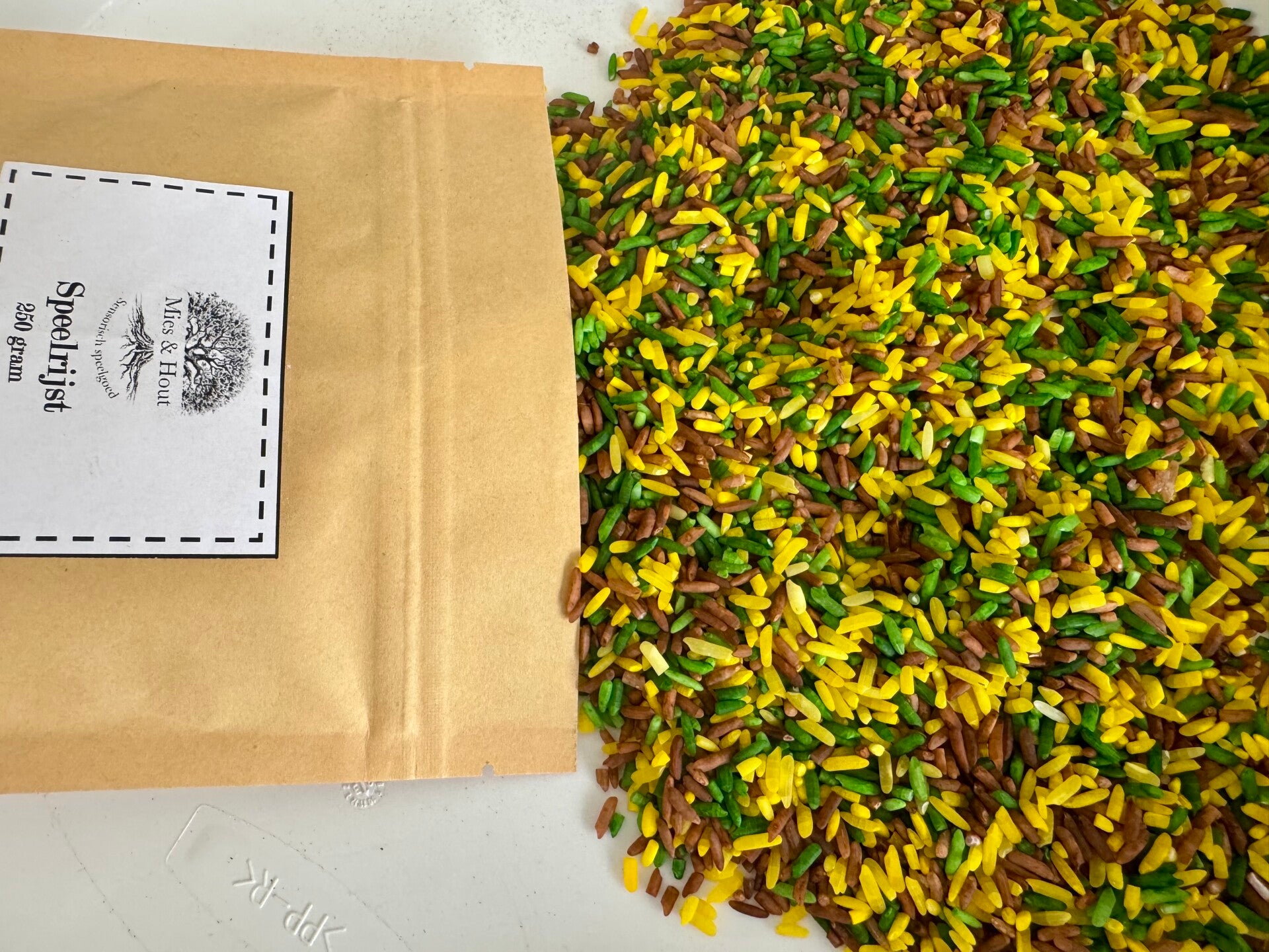 De speelrijst is kleurvast gekleurd door middel van natuurazijn, voedingskleurstof, gedroogd en afgebakken in de oven.