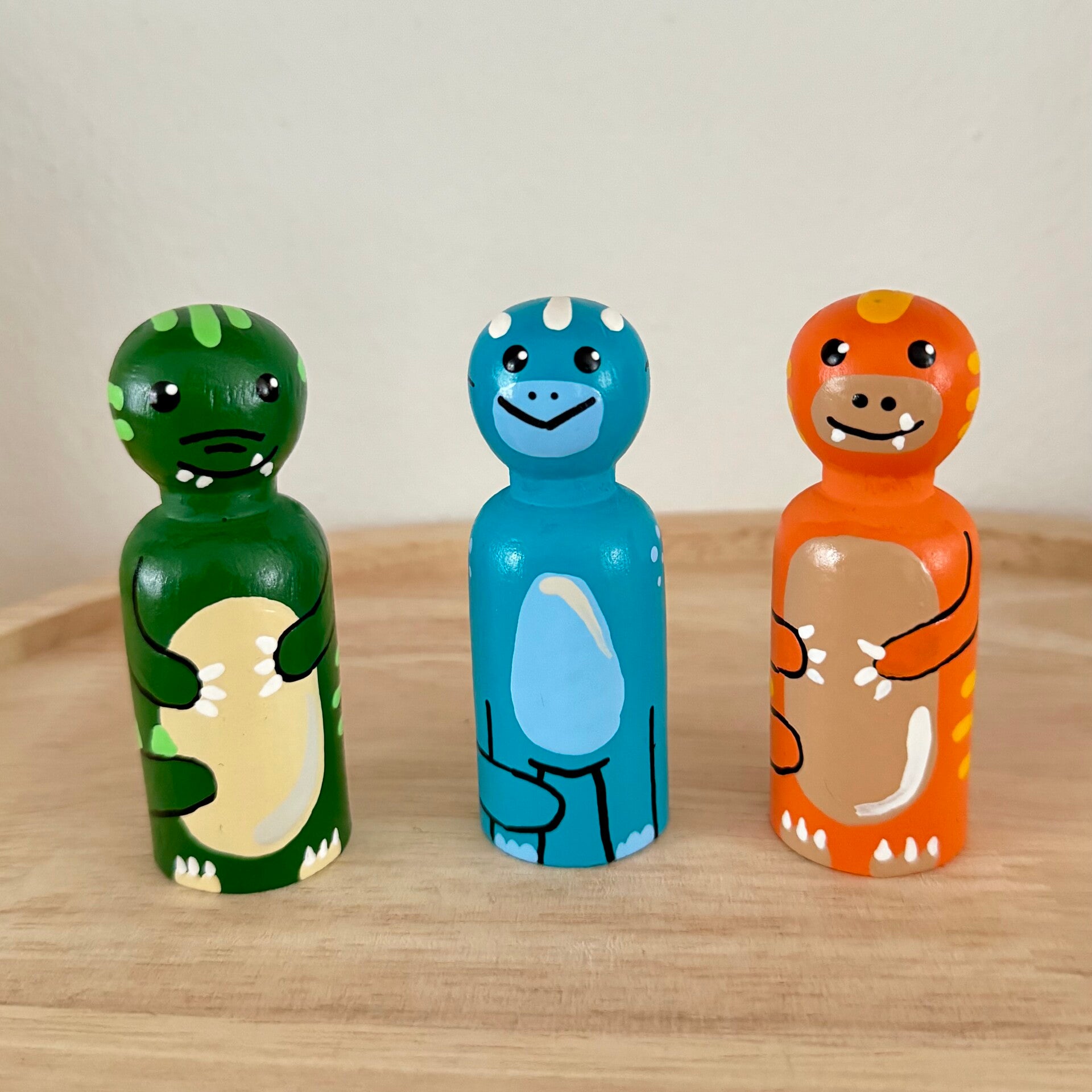 Setje van 3 verschillende dinosaurus pegdolls van 7,5 cm, een zakje speelrijst en een houten schepje.