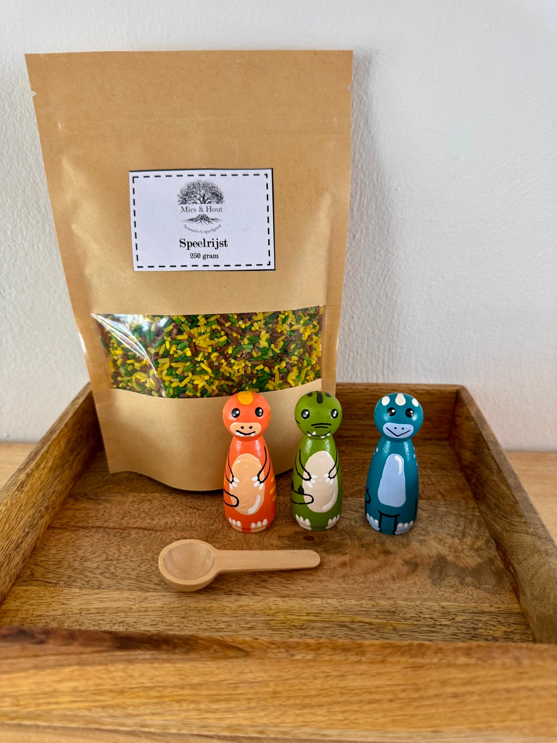 De speelrijst is kleurvast gekleurd door middel van natuurazijn, voedingskleurstof, gedroogd en afgebakken in de oven.