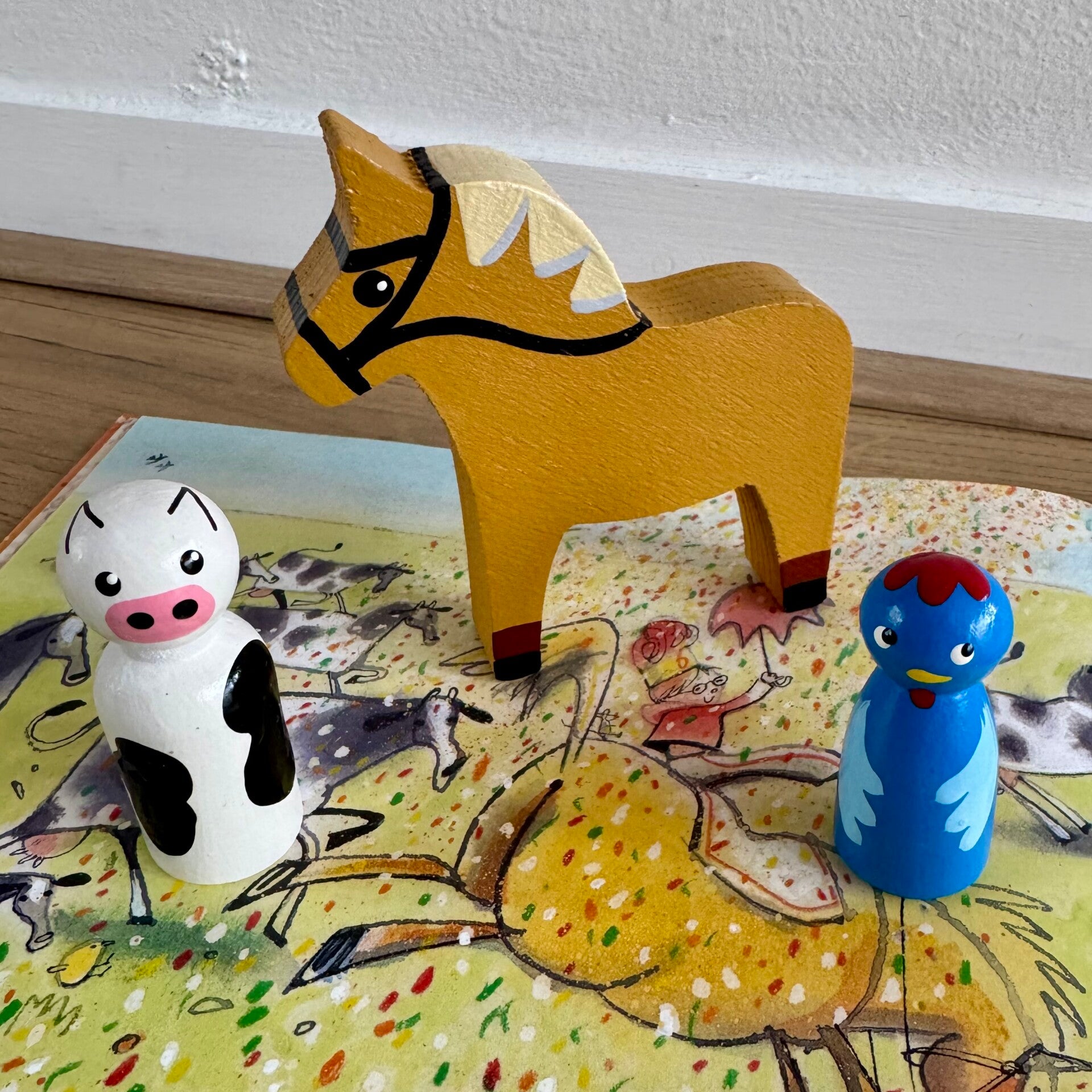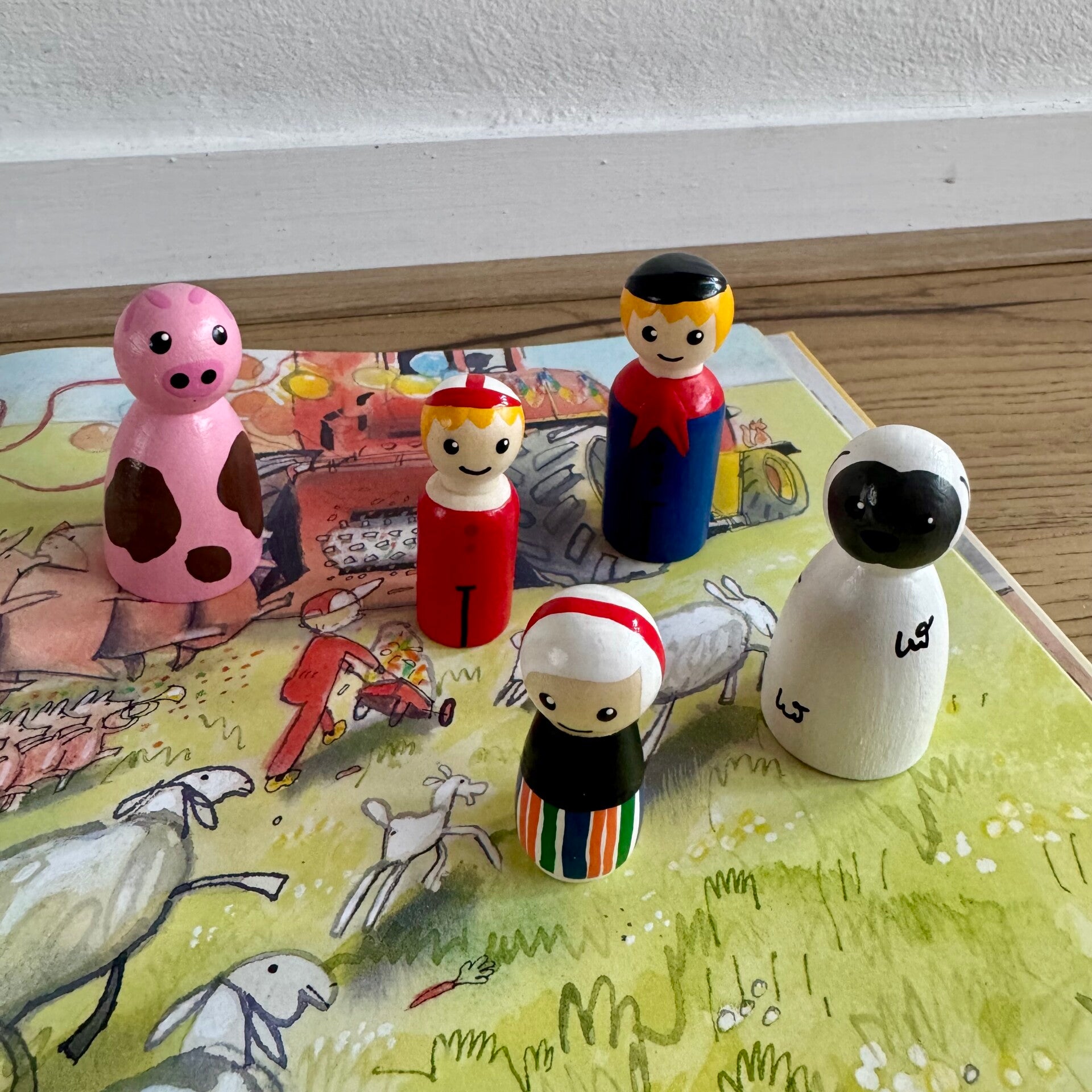Mooie set van 9 verschillende boerderij pegdolls in diverse grootte, waaronder de enige echt Boer Boris met zijn broertje en zusje en een houten kippenhok. Deze figuren zijn perfect om de boeken van Boer Boris tot leven te brengen of te gebruiken in het onderwijs op een thema tafel.