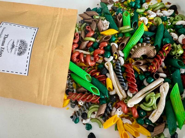 De pasta’s zijn gekleurd door middel van kindvriendelijke (gifvrij) acrylverf, gedroogd en afgebakken in de oven.