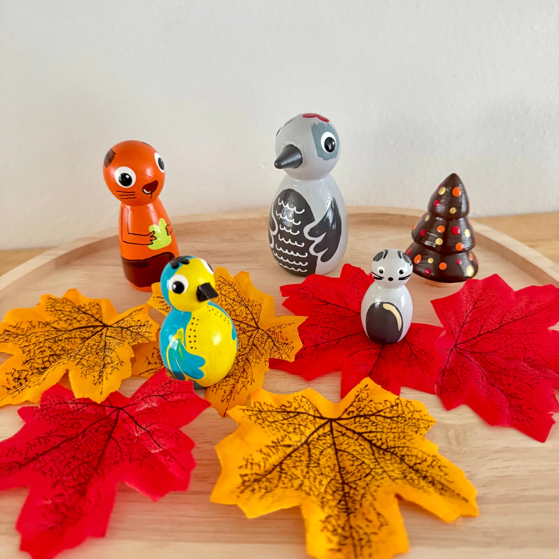 Een set van eekhoorn, een specht, vogel, muis en een herfstboom. Incl 6 gekleurde stoffen blaadjes. Mooi om het prentenboek van de Blaadjesdief tot leven te brengen.