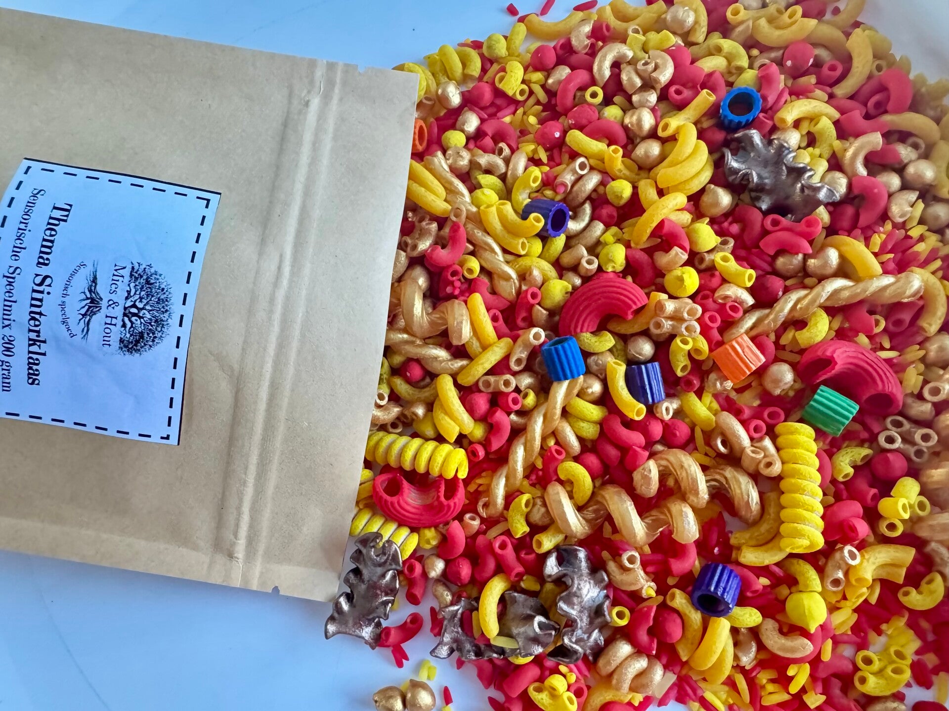 De pasta’s zijn gekleurd door middel van kindvriendelijke (gifvrij) acrylverf, gedroogd en afgebakken in de oven.