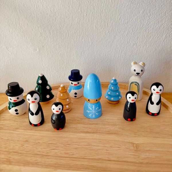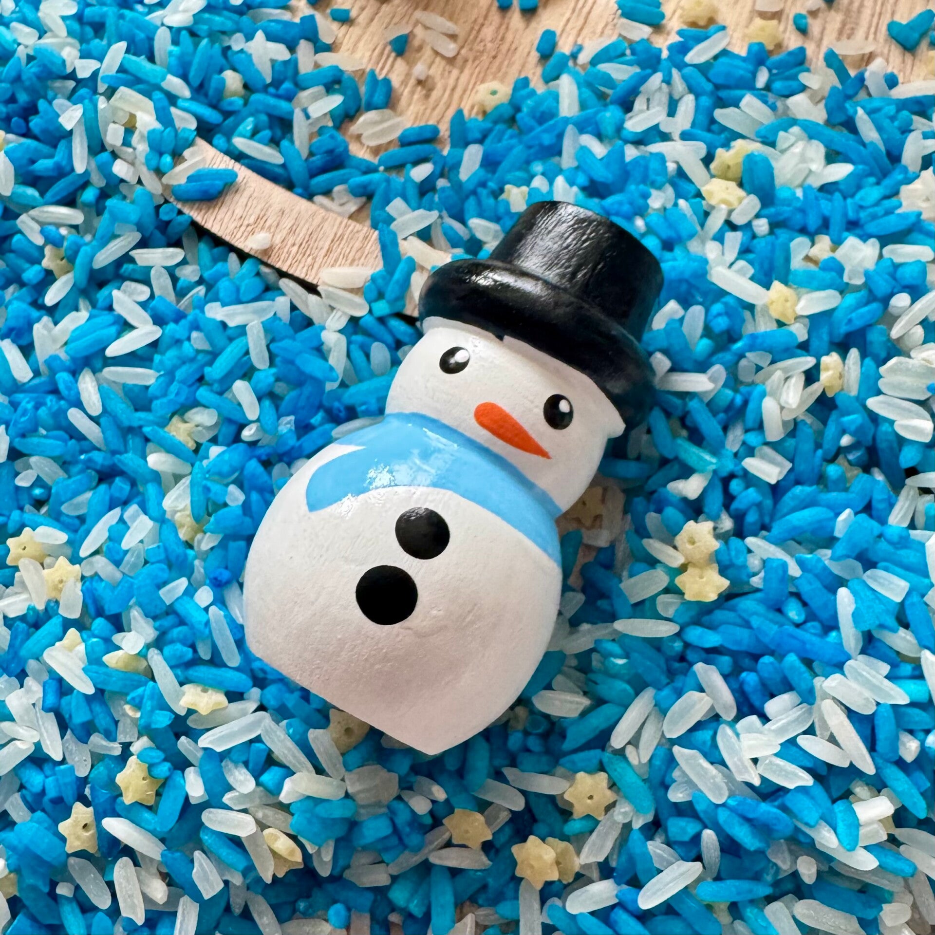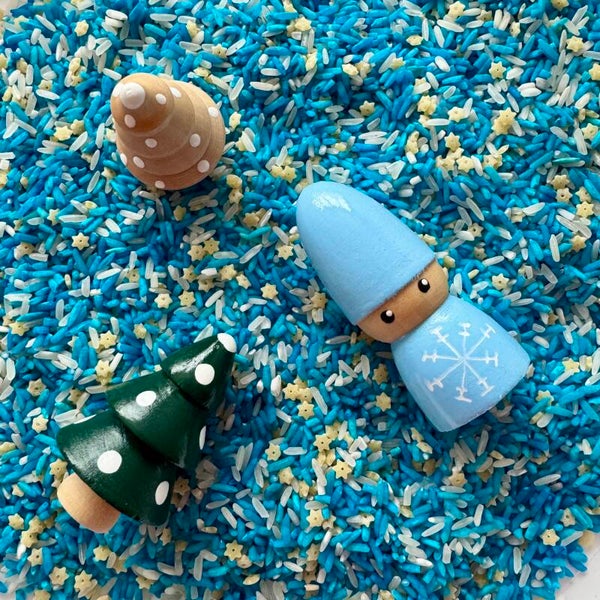 Mooie set van 11 verschillende Winter pegdolls in diverse grootte inclusief zakje speelrijst van 250 gram en een houten schepje.