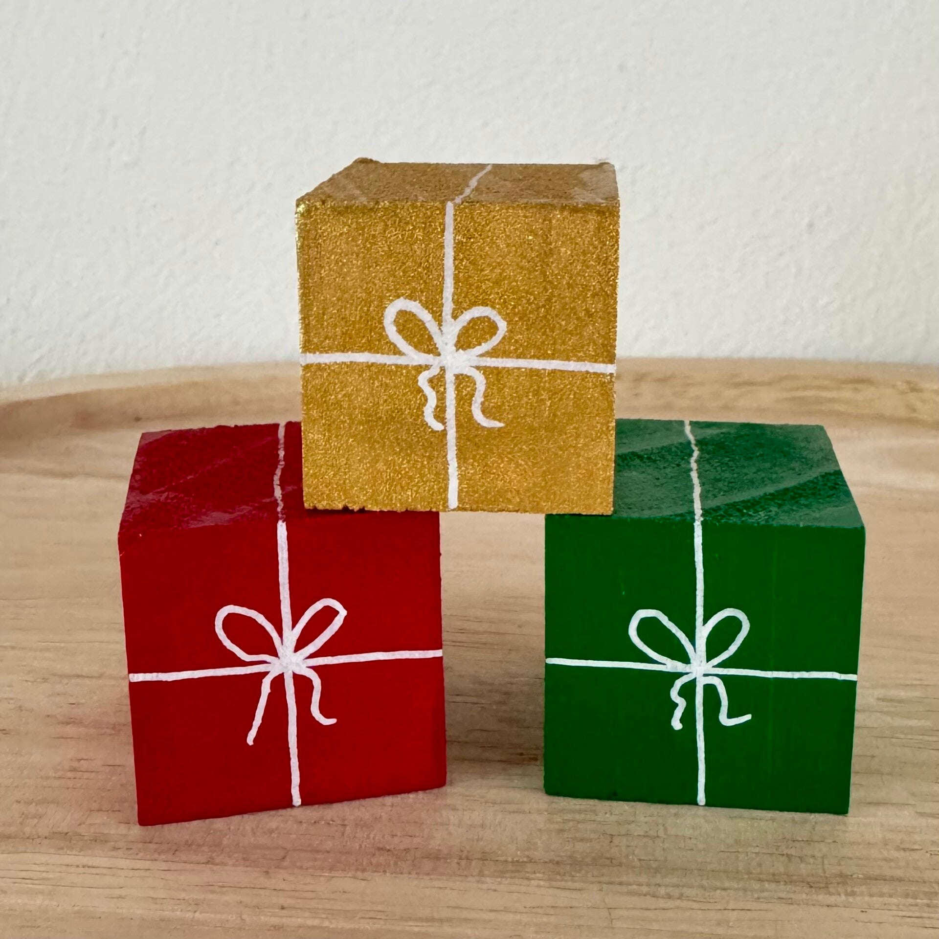 Leuke set van 3 houten speel cadeautjes. Afmetingen per blok: ongeveer 3x3x3 cm.