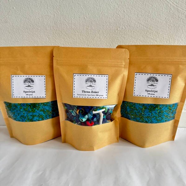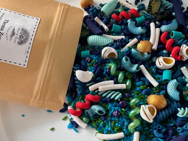 De speelrijst is kleurvast gekleurd door middel van natuurazijn, voedingskleurstof, gedroogd en afgebakken in de oven. De pasta’s zijn gekleurd door middel van kindvriendelijke (gifvrij) acrylverf, gedroogd en afgebakken in de oven.
